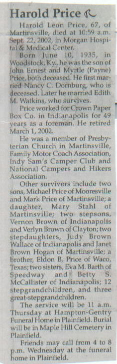 | Survived By | Widow; 2 sons, Michael and Mark Price; daughter, Mary Stahl; 2 stepsons, Vernon and Verlyn Brown; 2 stepdaughters, Judy Brown Wallace and Janet Brown Hogan; brother, Eldon B. Price; 2 sisters, Eva M. Barth and Betty S. McCallister; 12 stepgrandchildren; 3 three stepgreat-grandchildren. |