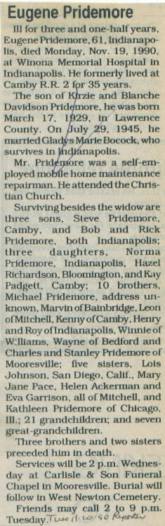 | Survived By | Wife; sons, Steve, Bob, and Rick Pridemore; daughters, Norma Pridemore, Hazell Richardson, and Kay Padgett. |