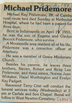 | Survived By | Parents, Eugene and Gladys Bocock Pridemore; brothers, Steven, Robert, and Ricky Lee Pridemore; sisters, Norma Jean Whitaker, Hazel Worthington, and Evelyn Kay Padgett. |