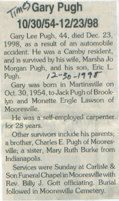 | Survived By | Wife; parents, Jack Pugh of Brooklyn and Monette Engle Lawson of Mooresville; sister, Mary Ruth Burke of Indianapolis. |