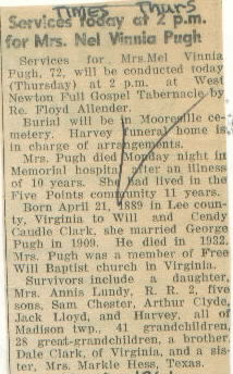 | Survived By | Sons, Sam, Chester, Arthur, Clyde, Jack Lloyd, and Harvey Pugh; daughter, Mrs. Annis Lundy; brother, Dale Clark; sister, Mrs. Markel Hess. |