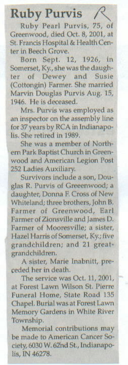 | Survived By | Son, Douglas R. Purvis; daughter, Donna F. Cross; brothers, John B., Earl, and James D. Farmer; sister, Hazel Harris; 5 grandchildren; 21 great-grandchildren. |