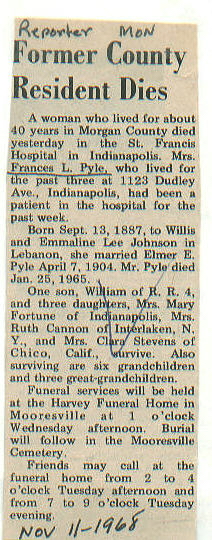 | Survived By | Son, William Pyle; daughters, Mrs. Mary Fortune, Mrs. Ruth Cannon, and Mrs. Clara Stevens. |