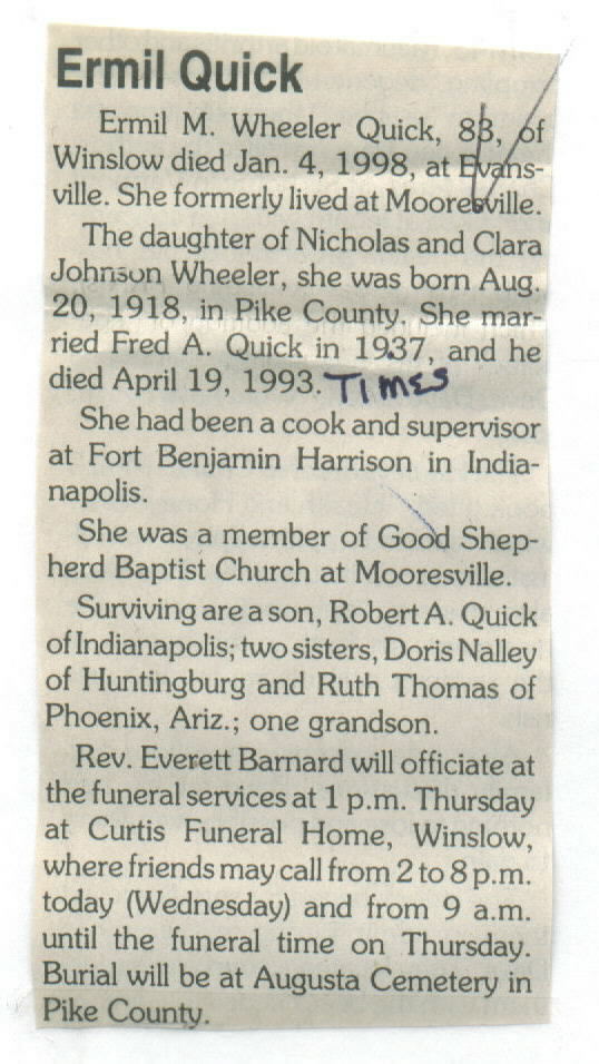 | Survived By | Son, Robert A. Quick; sisters, Doris Nalley and Ruth Thomas. |