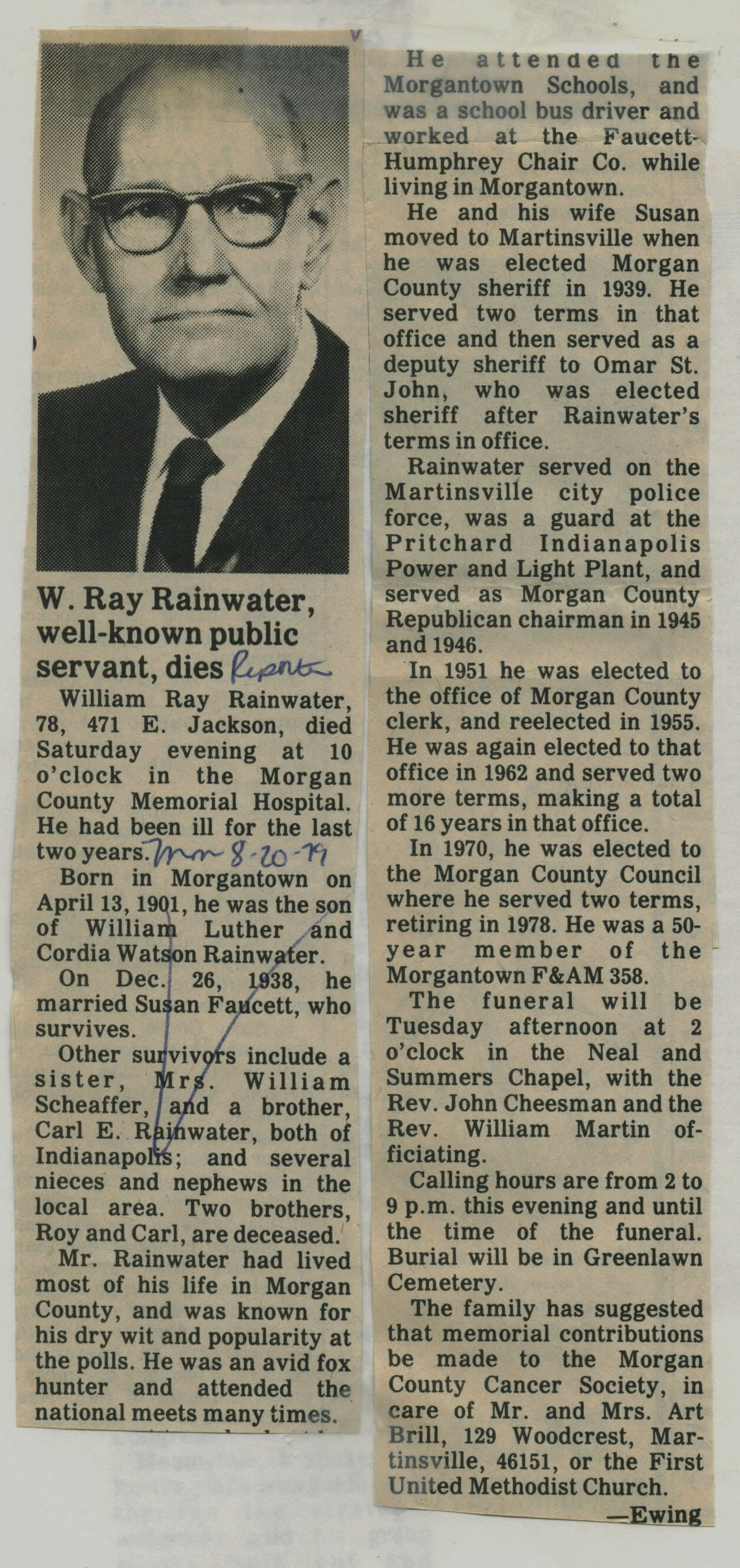 | Survived By | Wife; sister, Mrs. William Scheaffer; brother, Carl E. Rainwater. |