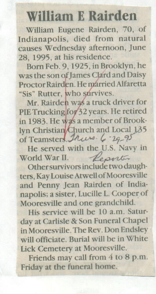 Survived By Wife; daughters, Kay Louise Atwell and Penny Jean Rairden; sister, Lucille L. Cooper.