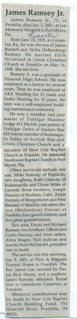 | Other | Preceded in death by parents, James Burdett and Nellie (Falkenburg) Ramsey; sons, David and Richard Ramsey; brothers, Gilbert and Curtis Ramsey; sisters, Alma Magee, Nell Jackson, and Juanita Noel McDonald. |