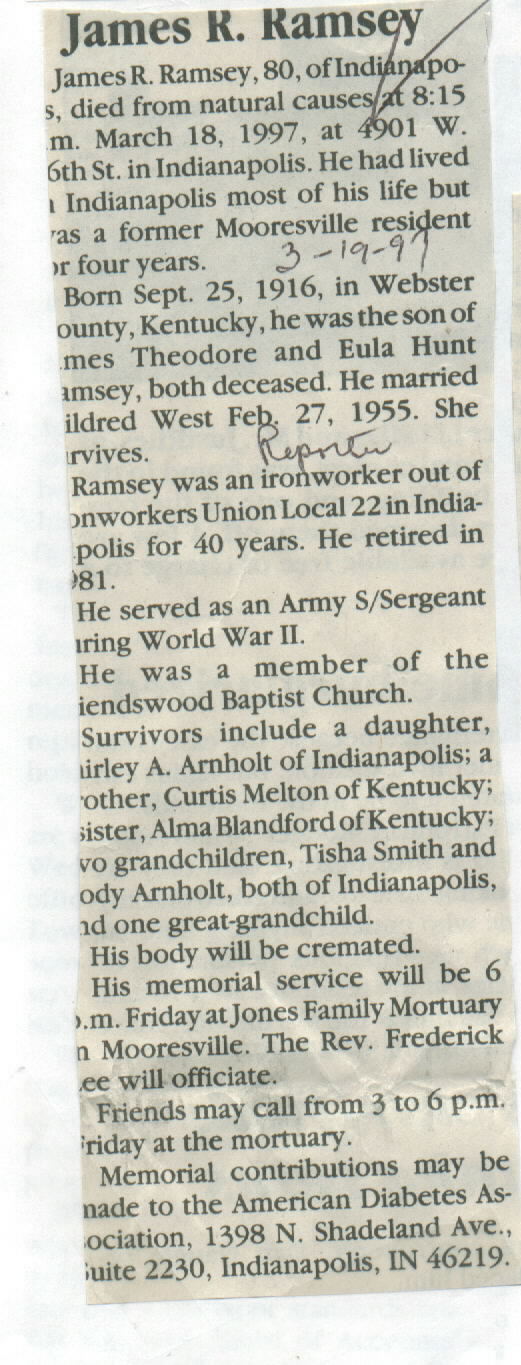 | Survived By | Wife; daughter, Shirley A. Arnholt; brother, Curtis Melton; sister, Alma Blandford. |