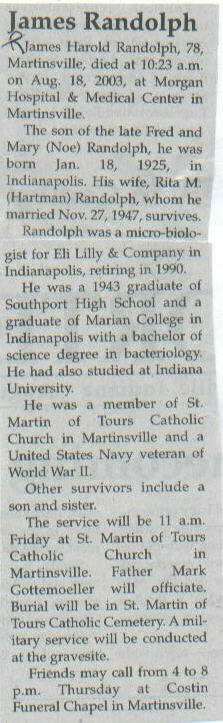 | Other | The son of the late Fred and Mary (Noe) Randolph, he was born in Indianapolis. United States Navy veteran of WW II. |