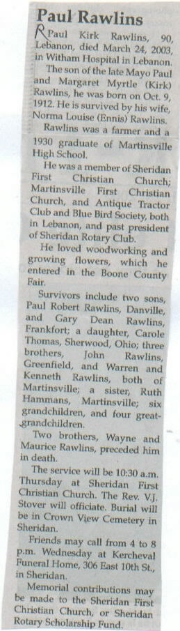 | Survived By | Widow; 2 sons, Paul Robert and Gary Dean Rawlins; daughter, Carole Thomas; 3 brothers, John, Warren, and Kenneth Rawlins; sister, Ruth Hammans; 6 grandchildren; 4 great-grandchildren. |
