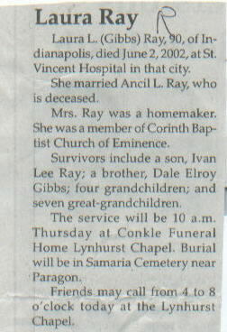 | Survived By | Son, Ivan Lee Ray; brother, Dale Elroy Gibbs; 4 grandchildren; 7 great-grandchildren. |