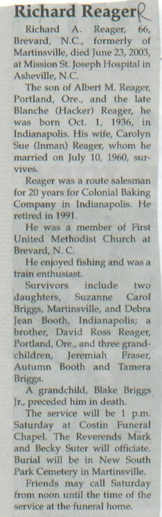 | Other | The son of Albert M. Reager, Portland, Ore., and the late Blanche (Hacker) Reager, he was born in Indianapolis. A grandchild, Blake Briggs, Jr., preceded him in death. |
