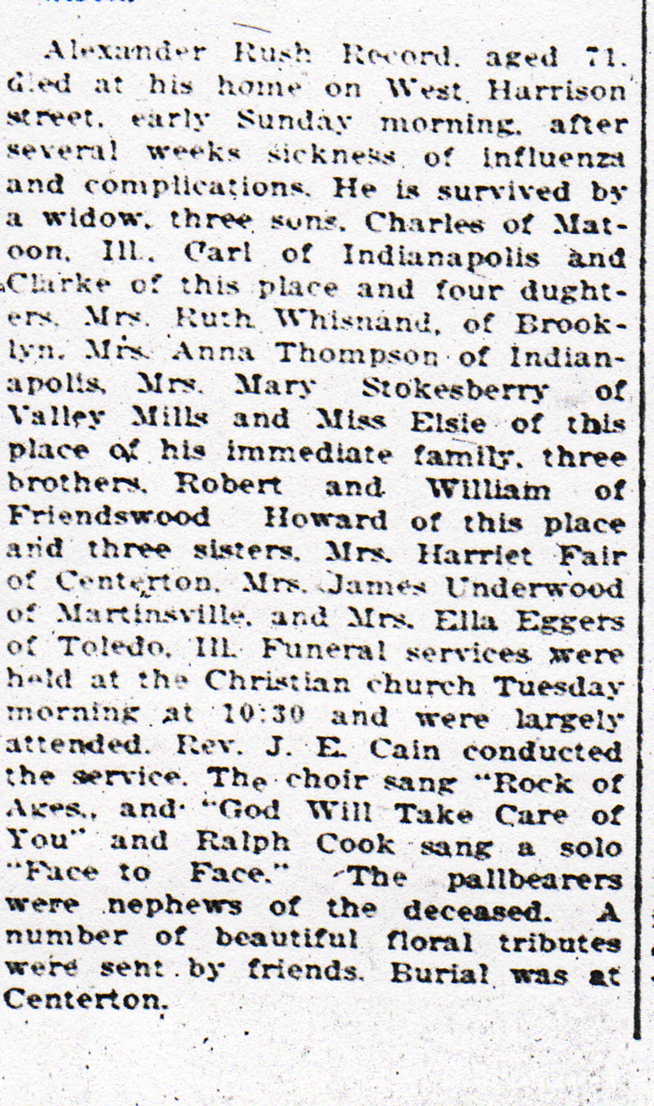 | Survived By | Widow; 3 sons, Charles, Carl, and Clark; 4 daughters, Ruth Whisnand, Anna Thompson, Mary Stokesberry, and Miss Elsie Record; 3 brothers, Robert, William, and Howard; 3 sisters, Harriet Fari, Mrs. James Underwood, and Mrs. Ella Eggers. |