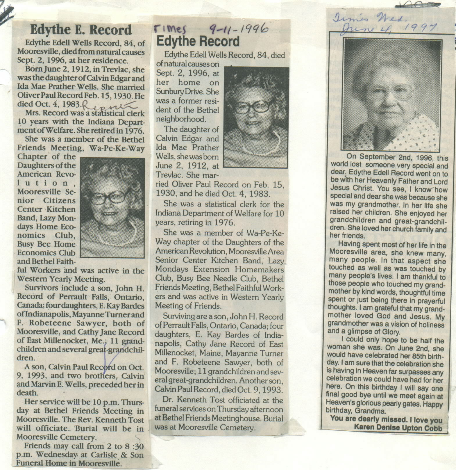| Other | Age 84. Carlisle funeral at Bethel Church (Rev. Kenneth Tost.) Buried Mooresville Cemetery. Parents: Calvin Edgar and Ida May Prather Wells. Member DAR, Bethel Friends Church, and other organizations. Died at home. Husband died 1983. |