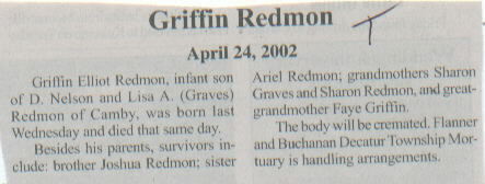 | Survived By | Parents, D. Nelson and Lisa A. (Graves) Redmon; brother, Joshua Redmon; sister, Ariel Redmon; grandmothers, Sharon Graves and Sharon Redmon; great-grandmother, Faye Griffin. |