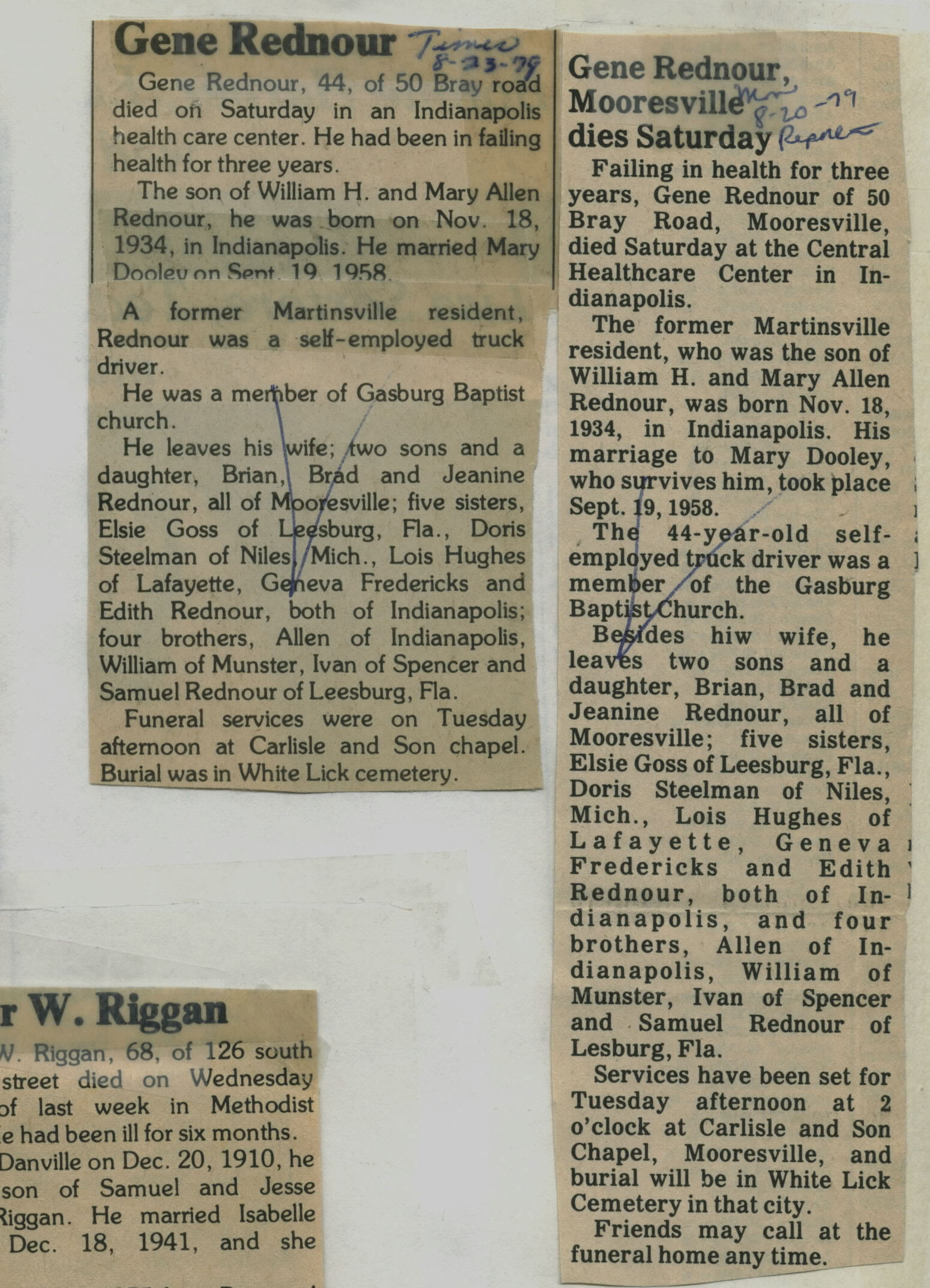 | Survived By | Wife; sons, Brian and Brad Rednour; daughter, Jeanine Rednour; 5 sisters; 4 brothers. |