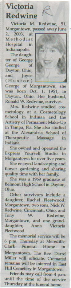 | Survived By | Spouse; daughter, Rachel Fleetwood; 2 sons, Nick W. and Tony W. Redwine; granddaughter, Anna Victoria Fleetwood. |