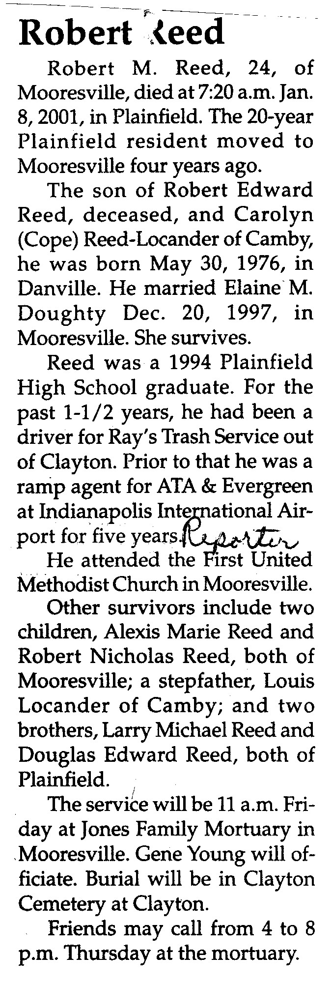 | Survived By | Wife; 2 children, Alexis Marie and Robert Nicholas Reed; stepfather, Louis Locander; 2 brothers, Larry Michael and Douglas Edward Reed. |