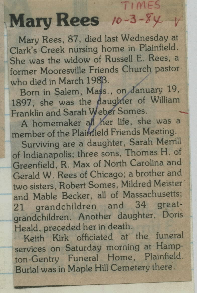 | Survived By | Sons, Thomas H., R. Max, and Gerald W. Rees; daughter, Sarah Merrill; brother, Robert Somes; sisters, Mildred Meister and Mabel Becker. |