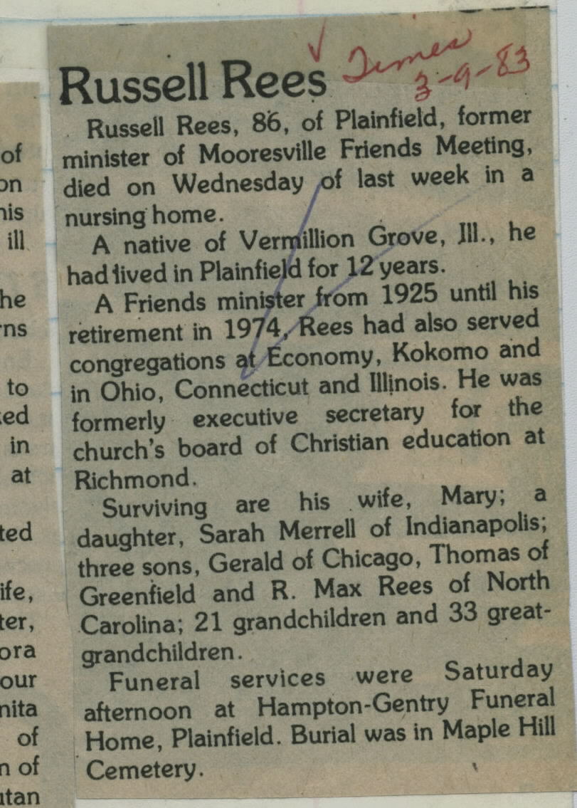 | Survived By | Wife, Mary; daughter, Sarah Merrell; sons, Gerald, Thomas, and R. Max Rees. |