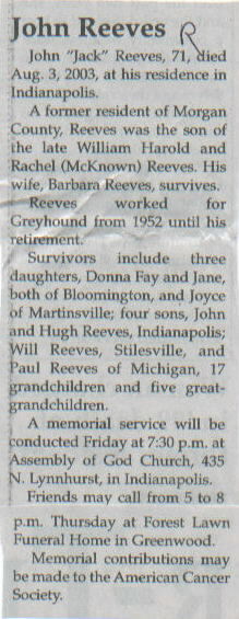 | Survived By | Spouse; 3 daughters, Donna Fay, Jane, and Joyce; 4 sons, John, Hugh, Will, and Paul Reeves; 17 grandchildren; 5 great-grandchildren. |