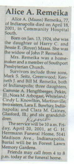 | Other | Preceded in death by spouse; parents, Harry C. and Bessie E. (Royer) Maass. |