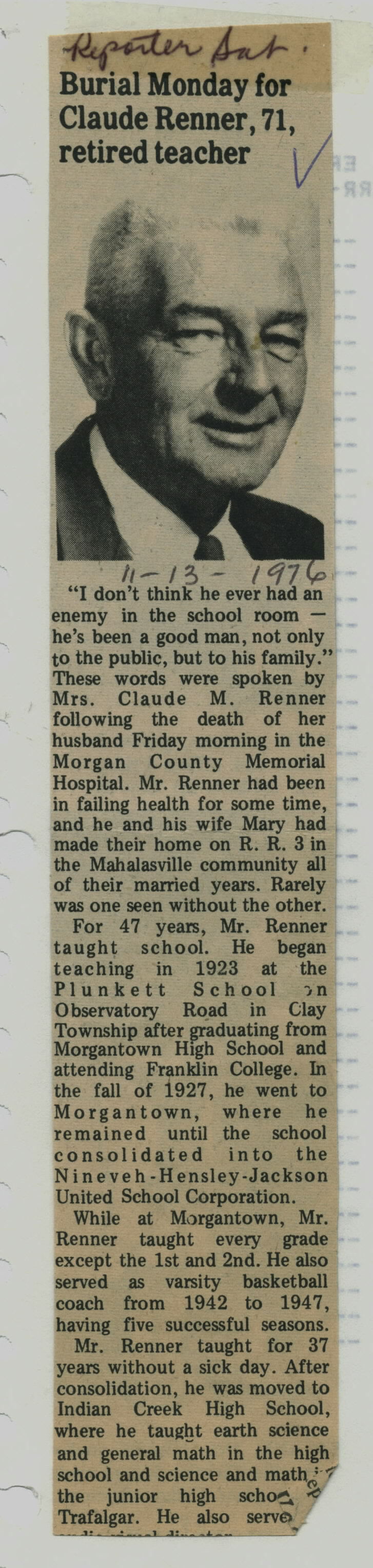 | Other | Age 71. Graduate Morgantown HS. Attended Franklin College. Taught every grade except 1st and 2nd. Varsity basketball Coach, 1942-1947, and 47 years at Indian Creek. |