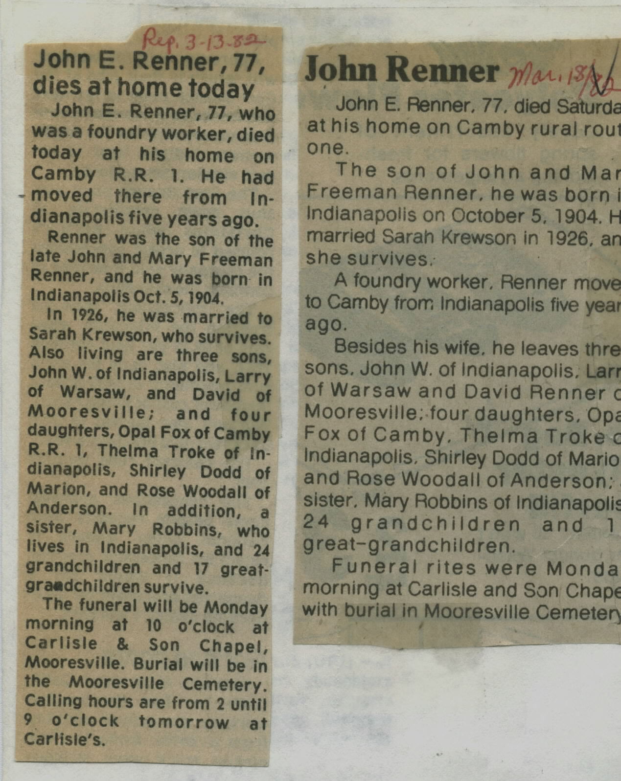 | Obituary Source | Martinsville Reporter, March 13, 1982 |