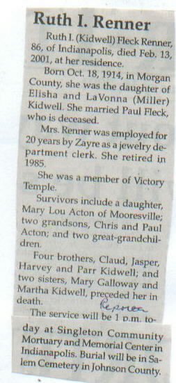 | Other | Preceded in death by spouse; parents, Elisha and LaVonna (Miller) Kidwell; brothers, Claud, Jasper, Harvey, and Parr Kidwell; sisters, Mary Gallowy and Martha Kidwell. |