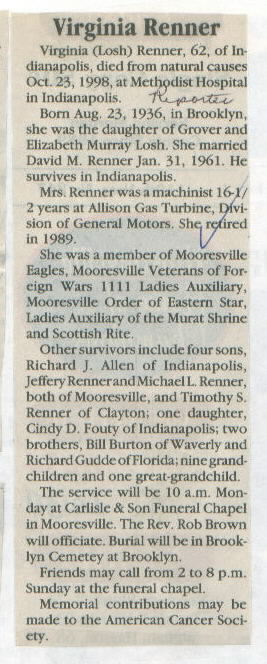 | Survived By | Husband; 4 sons, Richard J. Allen, Jeffery and Michael Renner of Mooresville, and Timothy S. Renner of Clayton; daughter, Cindy D. Fouty; 2 brothers, Bill Burton of Waverly and Richard Gudde of Florida; 9 grandchildren; 1 great-grandchild. |