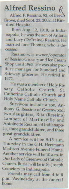| Survived By | Son, Anthony G. Ressino; 2 daughters, Rita (Ressino) Lambert and Antoinette Ressino; 3 grandchildren; 3 great-grandchildren. |