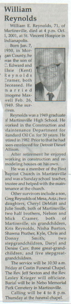 | Survived By | Spouse; son, Greg Reynolds; daughters, Cheryl DeMott and Julie Smith; half-brothers, Nelson and Mick Cramer; 6 grandchildren; 3 great-grandchildren. |