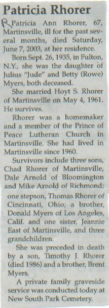 | Other | Parents: Julius "Jude" and Betty (Rowe) Myers, both deceased. Preceded in death by a son, Timothy J. Rhorer (died 1986) and a brother, Brent Myers. |