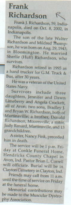 | Other | Parents: the late Walter Richardson and Mildred Thompson. Veteran of the United States Navy. A sister, Nancy Fink, preceded him in death. |