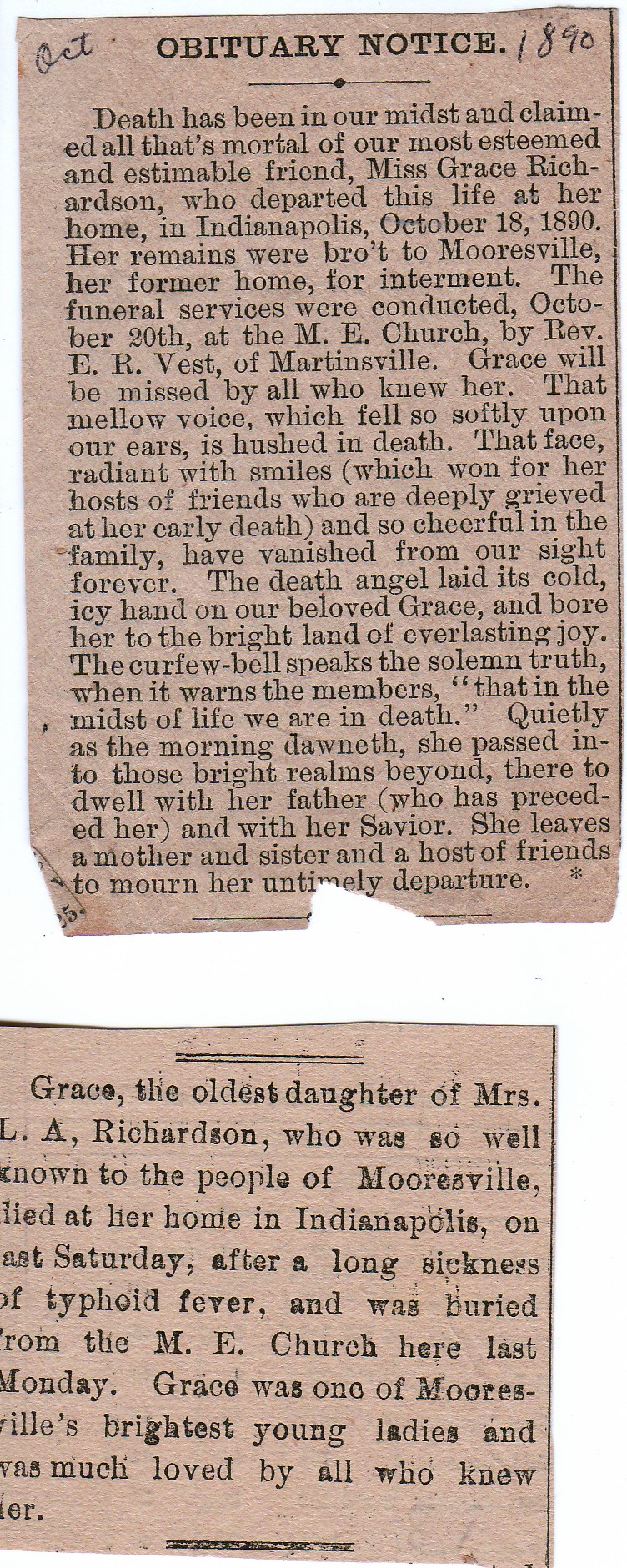| Other | Age 20. Died at home in Indianapolis after a long illness with typhoid fever. Daughter of T. Alex and Iva W. Hawk Richardson; buried with them in Mooresville Cemetery. Preceded in death by father, who died in 1889. |