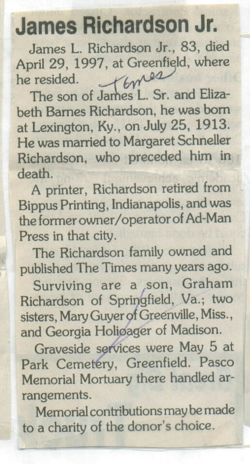 Other Age 83. Pasco Mortuary; graveside services at Park cemetery, Greenfield on May 5th. Was a printer. Richardson family owned and published Mooresville Times several years ago. Parents: James L., Sr. and Elizabeth Barnes Richardson.