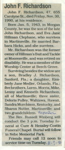 | Survived By | Widow; son, Bradley; daughter, Kimberly Jane Medler; 5 brothers, Loren, Morris, Mike, Lenny, and Kenneth, all of Martinsville; 3 sisters. |