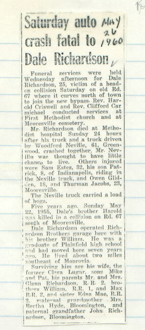 Other Age 25. Killed in a head-on collision Saturday on Old State Road 67. [Five years ago, May 22, 1955, his brother Harold was killed in a collision on Road 67 south of Mooresville.]