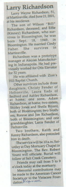 | Survived By | Spouse; mother, Effie (Kinney) Richardson; daughters, Christy Fender, Laura Eads, and Ashley Richardson; son, Adam Richardson; sisters, Shirley Jones and Sheila Bryant; brothers, Ronnie and Jim Richardson; 1 granddaughter. |