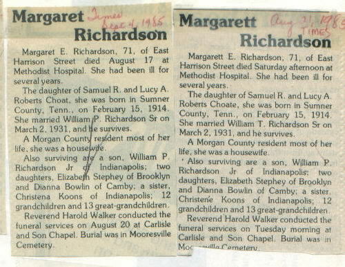 | Other | Age 71. Carlisle Chapel. Buried Mooresville Cemetery. Parents: Samuel R. and Lucy A. Roberts Choate. Died at Methodist hospital; born in Sumner Co., Tenn. |