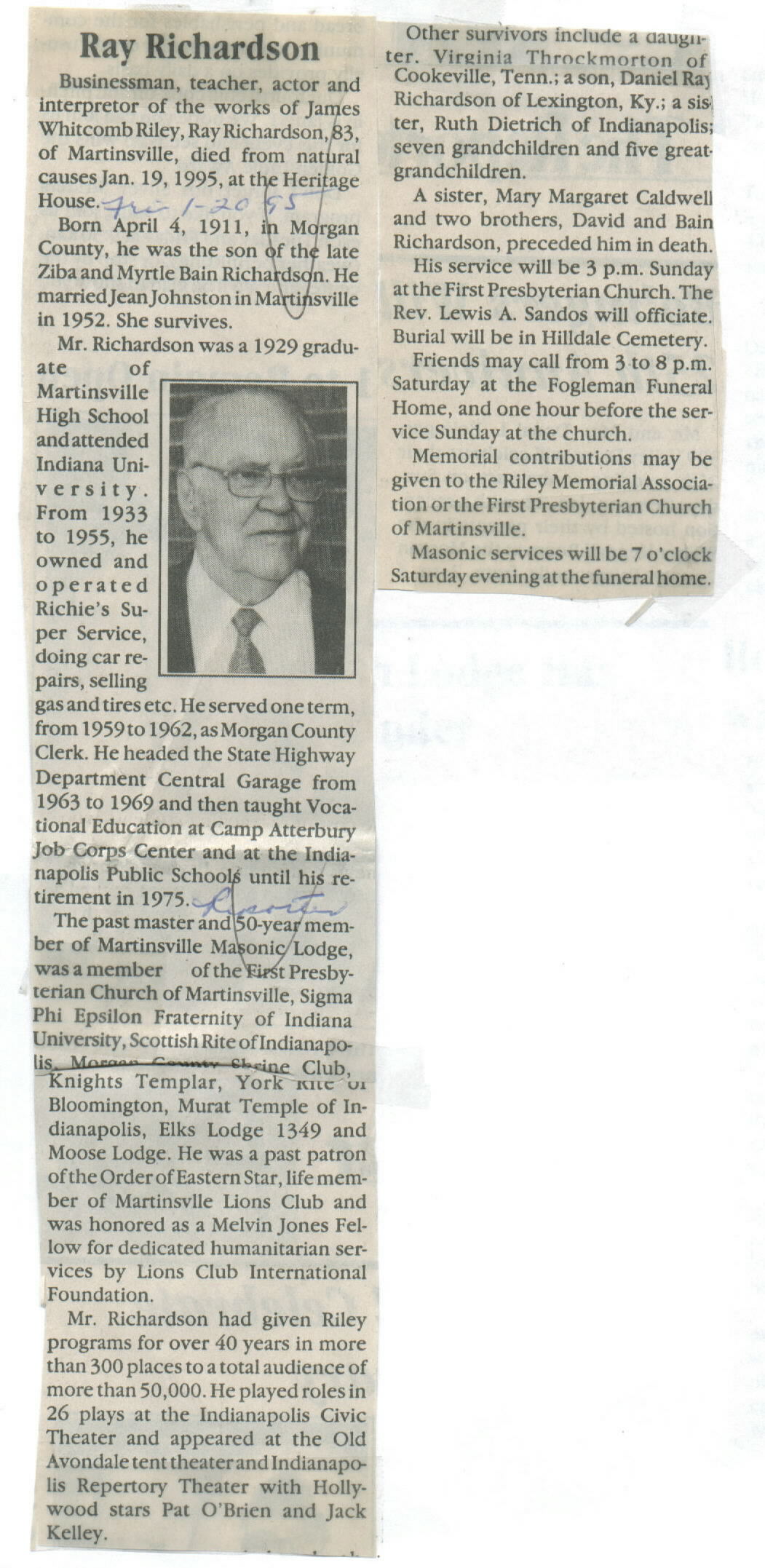 | Other | Age 83. Funeral at First Presbyterian Church. Buried Hilldale Cemetery. Businessman, teacher, actor, and well-known interpreter and lecturer on James Whitcomb Riley. 1929 graduate Martinsville HS. |