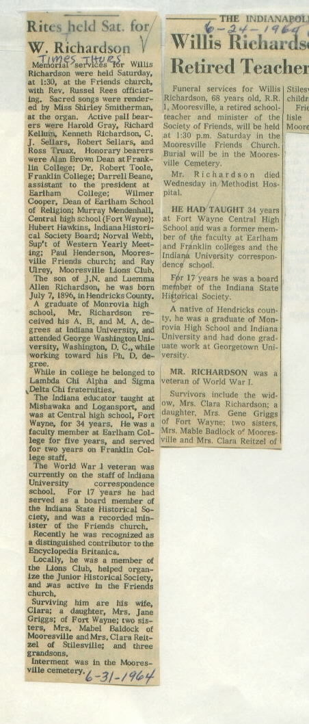 | Other | Age 68. Carlisle Chapel. Memorial service at Mooresville Friends Church (Rev. Russell Rees). Buried Mooresville Cemetery. Graduate Monrovia H.S., I.U., and others. Teacher at Ft. Wayne and faculty at Earlham and Franklin colleges. World War I veteran. |