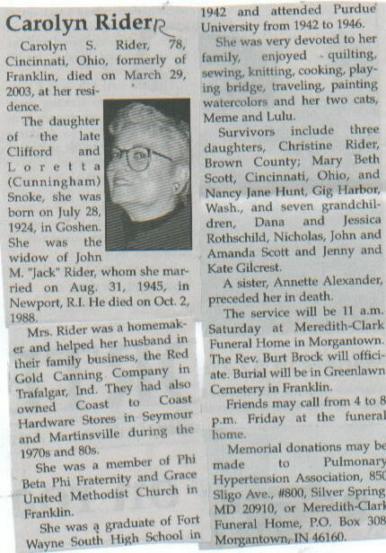 | Survived By | Three daughters, Christine Rider, Mary Beth Scott, and Nancy Jane Hunt; 7 grandchildren, Dana and Jessica Rothschild, Nicholas, John, and Amanda Scott, and Jenny and Kate Gilcrest. |