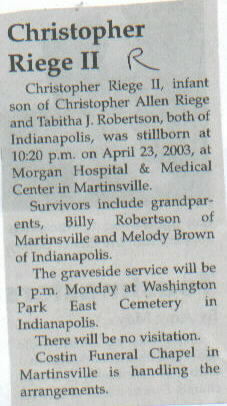 Survived By Parents, Christopher Allen Riege and Tabitha J. Robertson; grandparents, Billy Robertson and Melody Brown.