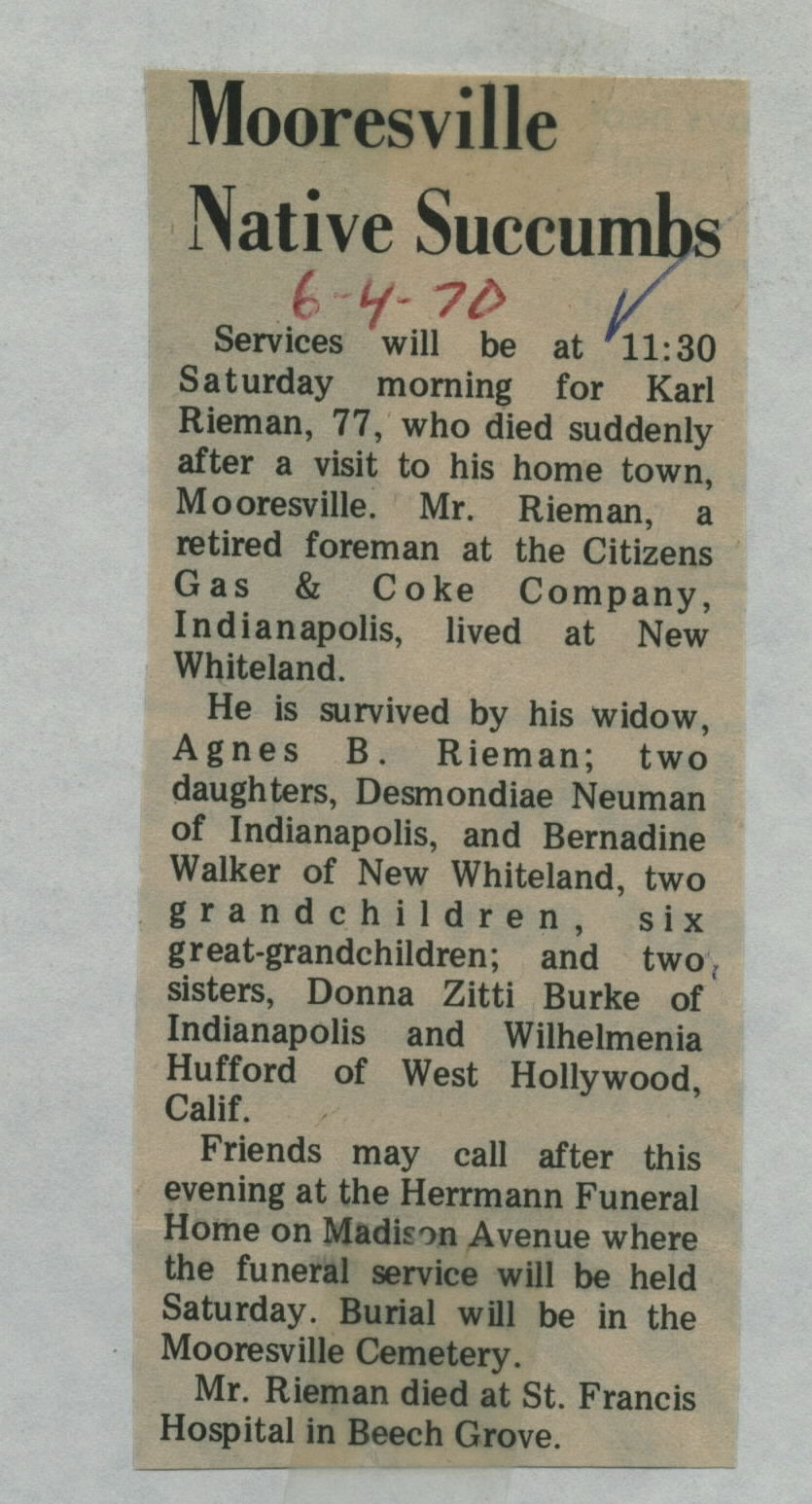 | Other | Herrman Funeral Madison Ave. Buried Mooresville Cemetery. Died after visit to his home town at St. Francis. |