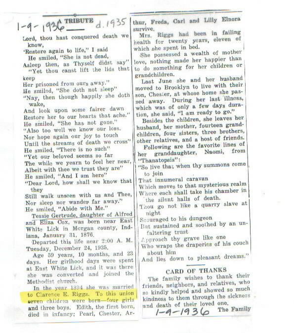 | Other | Age 59 years, 10 months, and 23 days. Born E. White Lick area. Preceded in death by firstborn child, Edith, who died in infancy. |