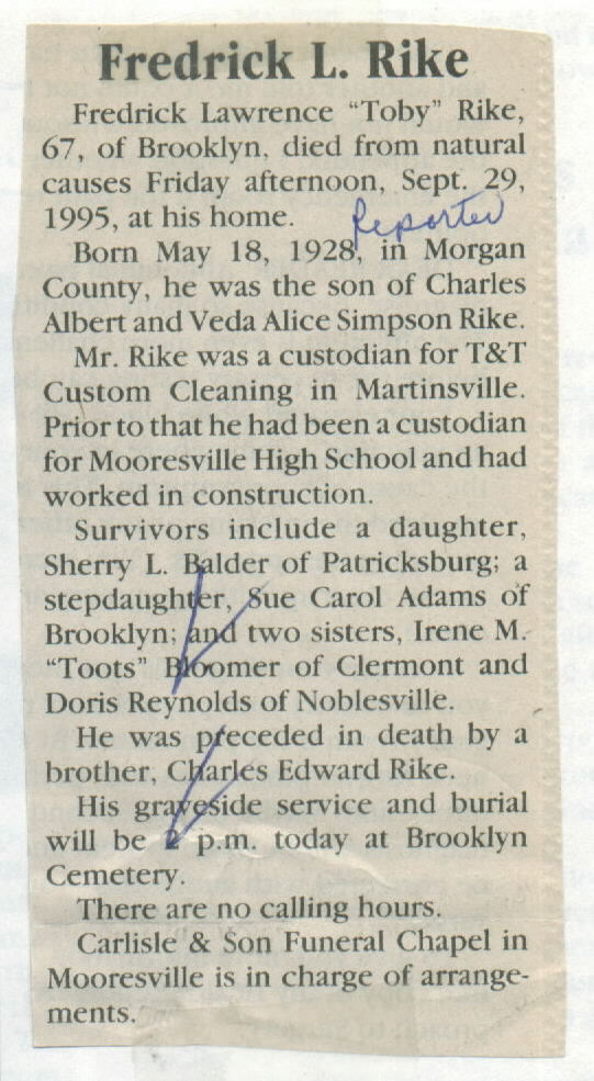 | Other | Age 67. Carlisle graveside services and burial at Brooklyn cemetery. Parents: Charles Albert and Veda Alice Simpson Rike. Custodian for Mooresville High School. Died at home. |