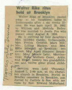 | Other | Age 75. Died at home of daughter in Indianapolis. Carlisle funeral at Brooklyn Christian Church. Buried Bradley cemetery at Brooklyn. |