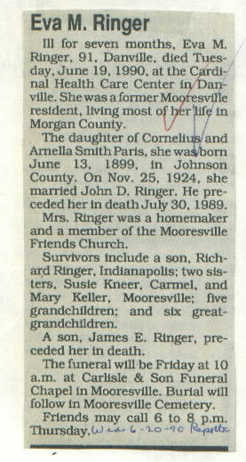 | Other | Age 91. Carlisle Chapel. Buried Mooresville Cemetery. Died at Cardinal Health Care Center, Danville. Parents: Cornelius and Arnella Smith Paris. Member Friends Church. |