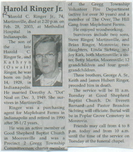 | Other | Son of the late Harold C. Ringer, Sr. and Kathryn (Oswalt) Ringer, he was born in Indianapolis. Three brothers, George A., Sr., Keith, and James Hubert Ringer, preceded him in death. |